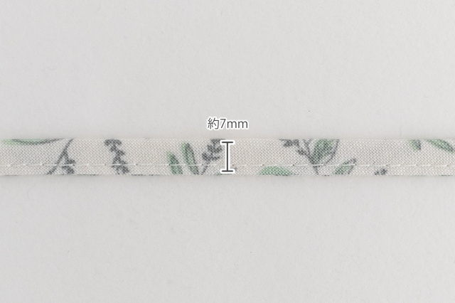 コットンを4つ折りにしてミシンステッチを施した、約7mm幅の柔らかいループひもです。