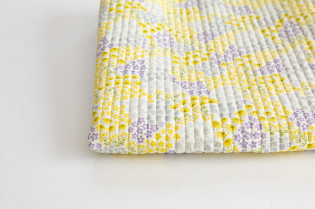 コットン生地で中綿をサンドし、0.8cm間隔のキルティングスティッチを施してあり、ワイド幅タイプよりしっかりめの手ざわりが特徴。