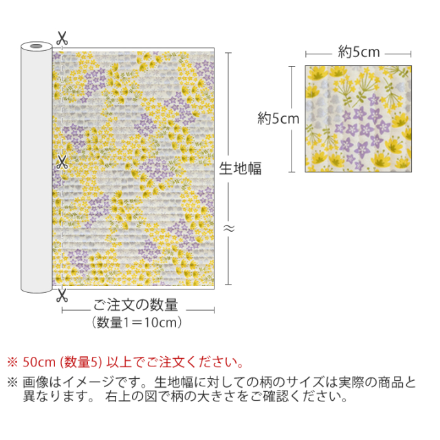 オーダーカット販売 生地幅×10cm単位(ご注文数量1=10cm) 必ず50cm(数量5)以上でご注文下さい(売切れの場合は除きます) 例)「数量5」でご注文→生地幅×50cmの生地 「数量23」でご注文→生地幅×230cmの生地 |