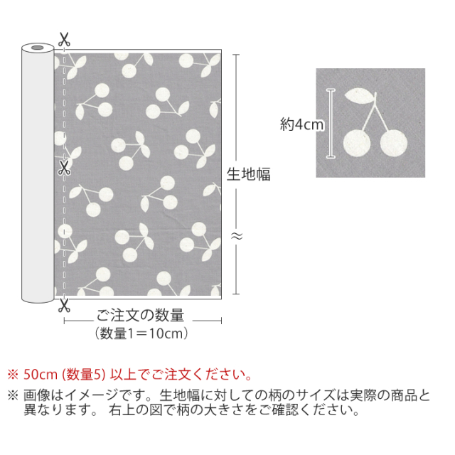 オーダーカット販売 生地幅×10cm単位(ご注文数量1=10cm) 必ず50cm(数量5)以上でご注文下さい(売切れの場合は除きます) 例)「数量5」でご注文→生地幅×50cmの生地 「数量23」でご注文→生地幅×230cmの生地 |