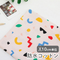 淡い薄ピンク地に、赤・青・黄・緑などビビットな色のモチーフが描かれた防水コットン生地です。