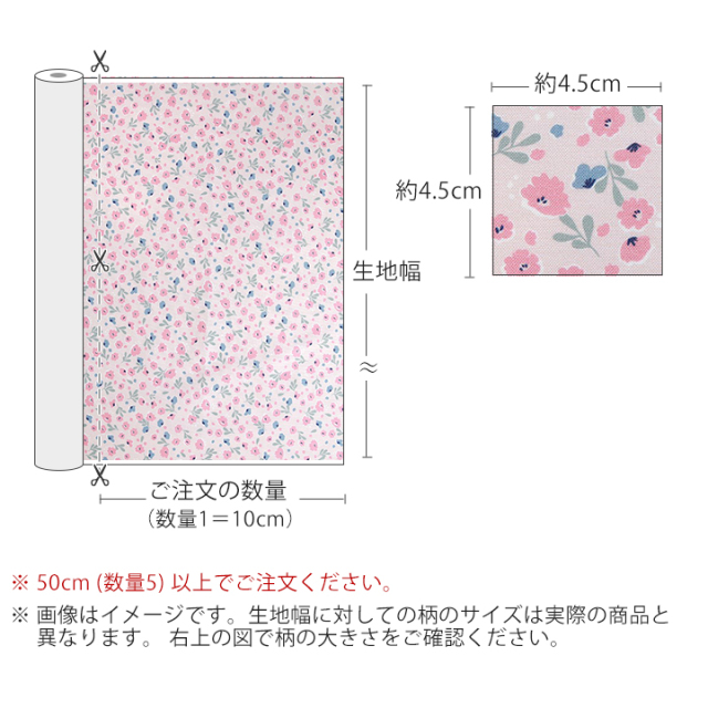 オーダーカット販売 生地幅×10cm単位(ご注文数量1=10cm) 必ず50cm(数量5)以上でご注文下さい(売切れの場合は除きます) 例)「数量5」でご注文→生地幅×50cmの生地 「数量23」でご注文→生地幅×230cmの生地 |