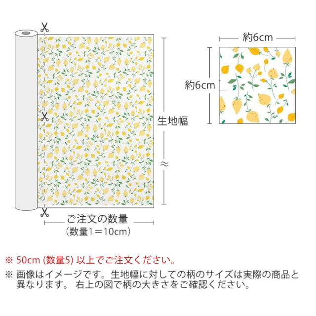 オーダーカット販売 生地幅×10cm単位(ご注文数量1=10cm) 必ず50cm(数量5)以上でご注文下さい(売切れの場合は除きます) 例)「数量5」でご注文→生地幅×50cmの生地 「数量23」でご注文→生地幅×230cmの生地 |