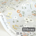 ごく薄いブルーグレー地に、丸みを帯びた可愛い草花が生地一面にデザインされた防水コットン生地です。