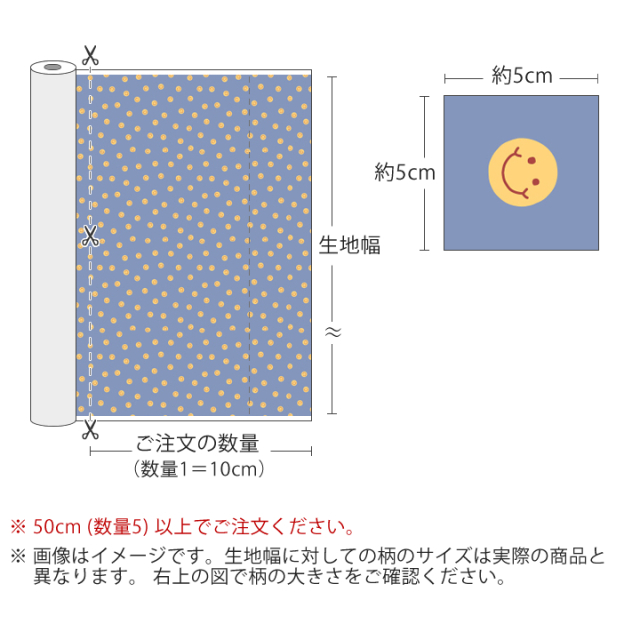 オーダーカット販売 生地幅×10cm単位(ご注文数量1=10cm) 必ず50cm(数量5)以上でご注文下さい(売切れの場合は除きます) 例)「数量5」でご注文→生地幅×50cmの生地 「数量23」でご注文→生地幅×230cmの生地 |