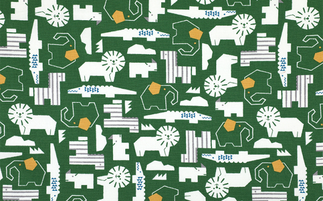 鮮やかな緑地に、積み木のようなアニマル柄が一面にデザインされた防水オックス生地です。