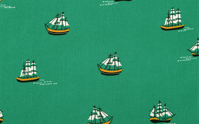 ディープグリーン地に、白や黒、黄色のはっきりとした船柄が大人っぽい印象の防水オックス生地です。
