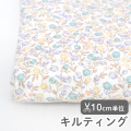 ホワイト地に、ほのかに色づく優しいカラーで花々が描かれたキルティング生地です。