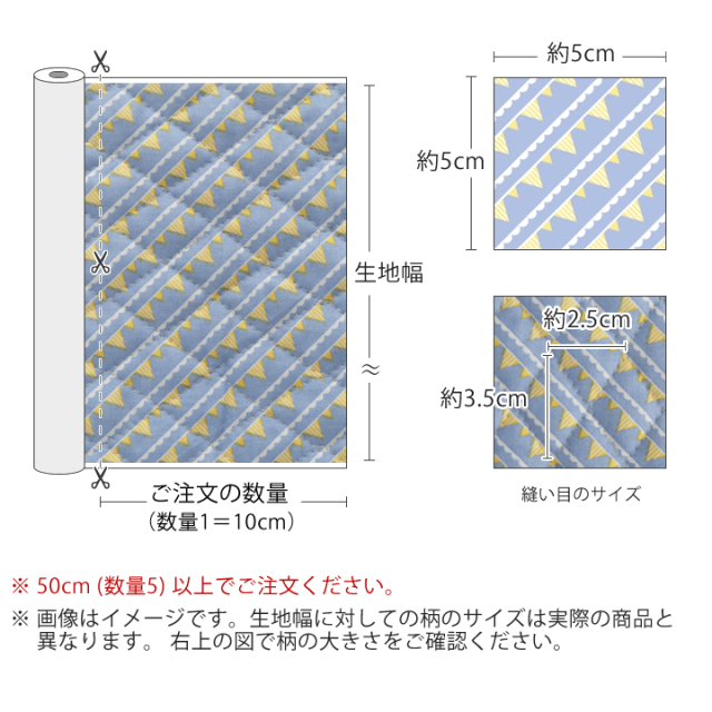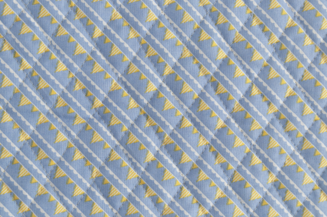 くすみがかったスカイブルー地に規則的に並んだ黄色いフラッグと波模様がさわやかなデザインのキルティング生地です。