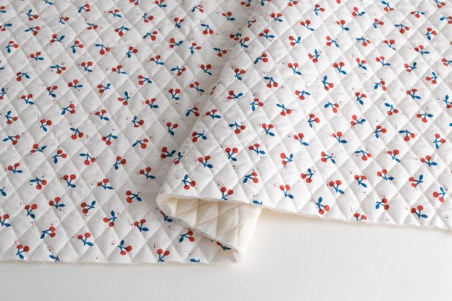ホワイト地に、切り絵のようなデザインのさくらんぼが爽やかで愛らしいキルティング生地です。