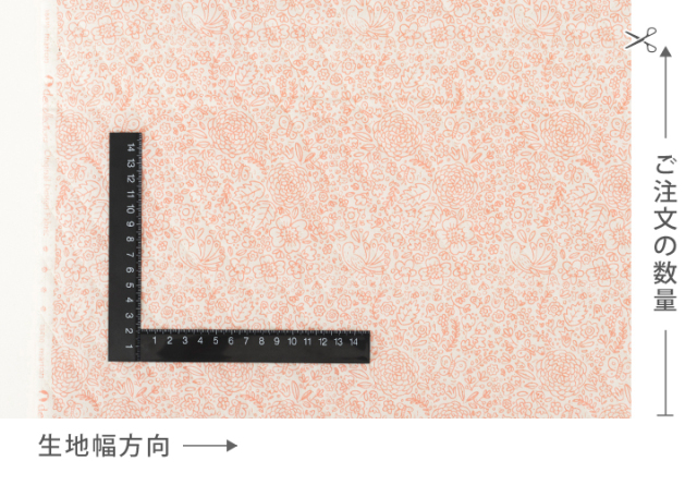 オーダーカット販売 生地幅×10cm単位(ご注文数量1=10cm) 必ず50cm(数量5)以上でご注文下さい(売切れの場合は除きます) 例)「数量5」でご注文→生地幅×50cmの生地 「数量23」でご注文→生地幅×230cmの生地 |