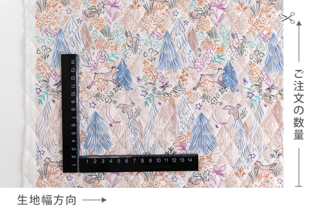 キルティング生地 素材:表 コットン100% 裏 コットン・ポリエステル 中綿 ポリエステル100% 生地幅:105cm 柄の向き:あり 厚み:ごく厚い