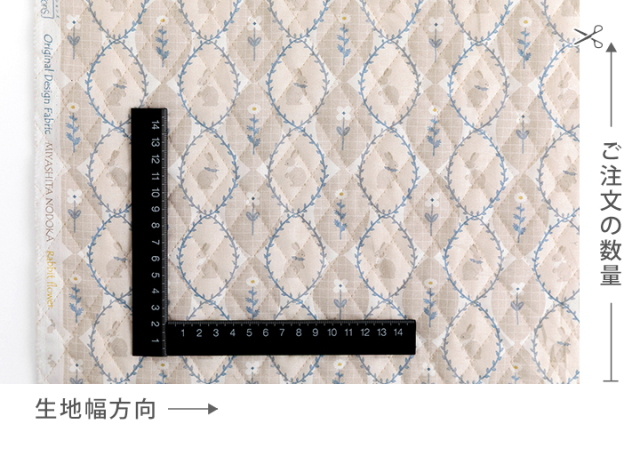 キルティング生地 素材:表 コットン100% 裏 コットン・ポリエステル 中綿 ポリエステル100% 生地幅:105cm 柄の向き:あり 厚み:ごく厚い