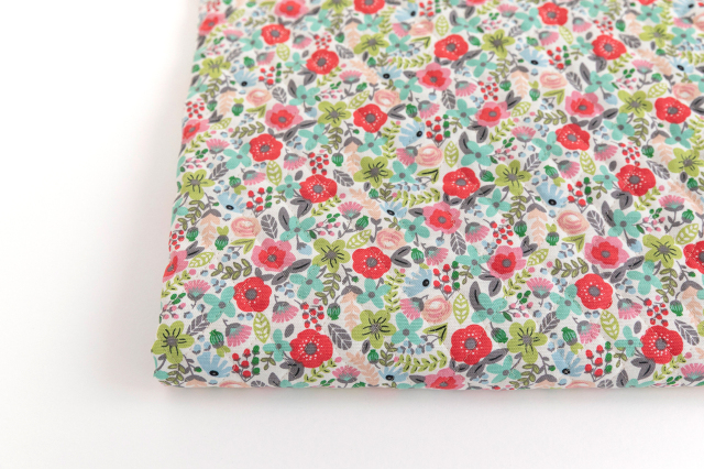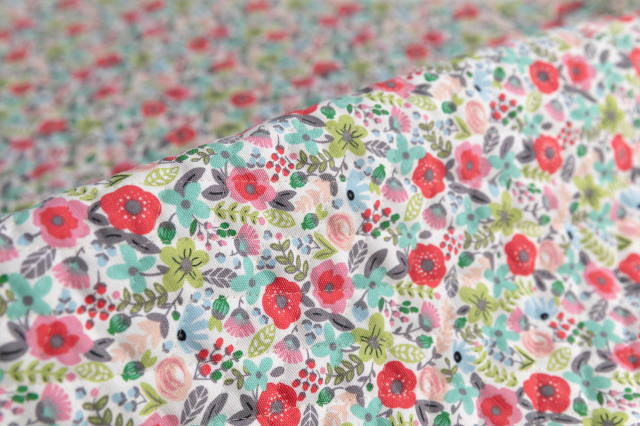 色とりどりの小花が並ぶ華やかなデザインのオックスキルティング生地です。