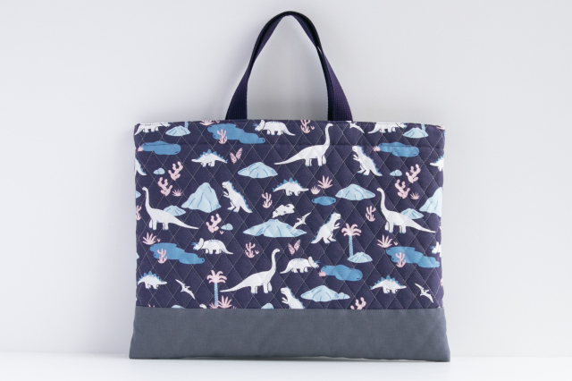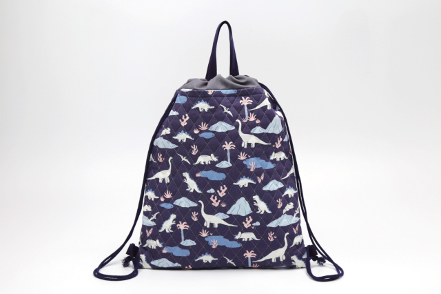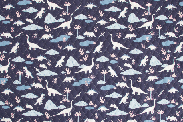 色褪せたようなインクブルー地に、ユーモラスな恐竜たちと火山や原始植物を描いたオックスキルティング生地です。