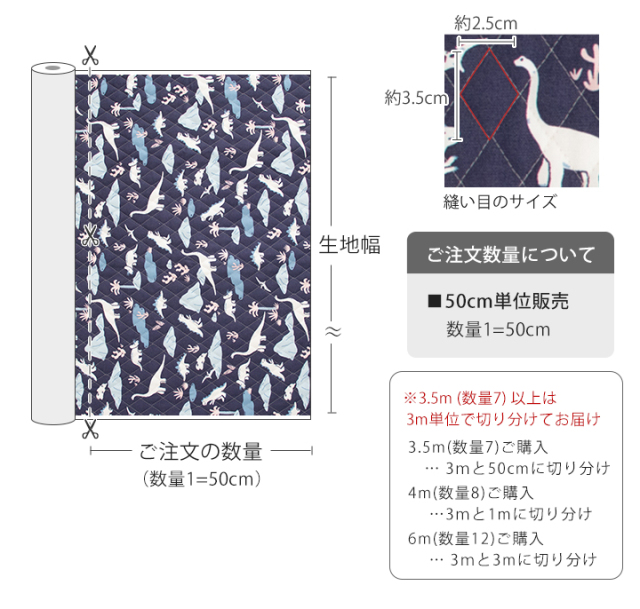 オーダーカット販売 生地幅×50cm単位(ご注文数量1=50cm) 例)「数量2」でご注文→生地幅×100cmの生地 「数量5」でご注文→生地幅×250cmの生地 ※3.5m(数量7)以上は3m単位で切り分けてのお届けとなります。ご了承ください。 |