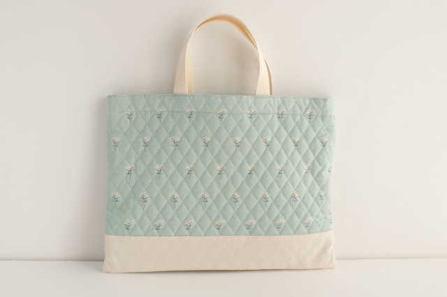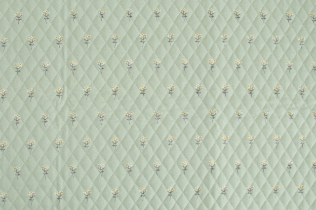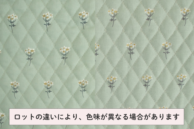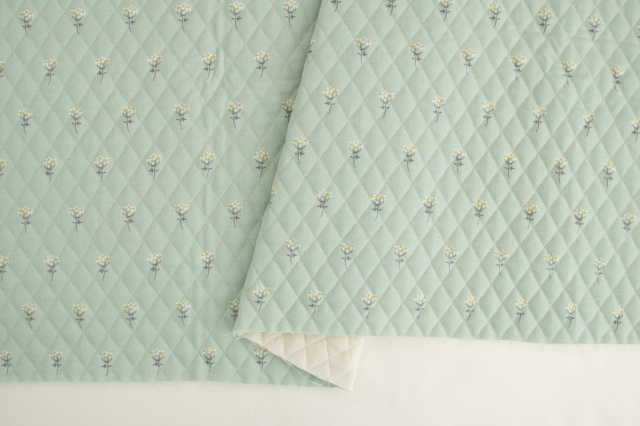 淡いグレイッシュグリーン地に白い花が咲く、上品な印象のオックスキルティング生地です。