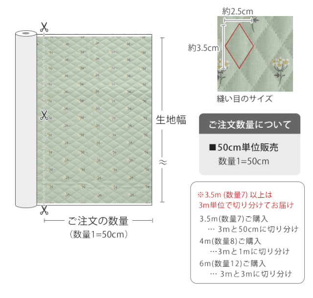 オーダーカット販売 生地幅×50cm単位(ご注文数量1=50cm) 例)「数量2」でご注文→生地幅×100cmの生地 「数量5」でご注文→生地幅×250cmの生地 ※3.5m(数量7)以上は3m単位で切り分けてのお届けとなります。ご了承ください。 |