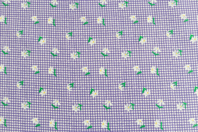 あざやかな色合いのパープルチェック地に、白いデイジーが描かれたラミネート生地です。