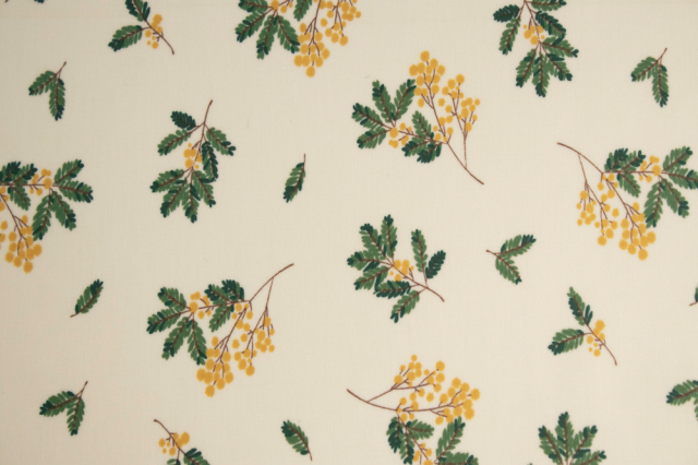 落ち着いたくすみクリーム地に、繊細なミモザの枝葉があたたかみを添える、上品なラミネート生地です。