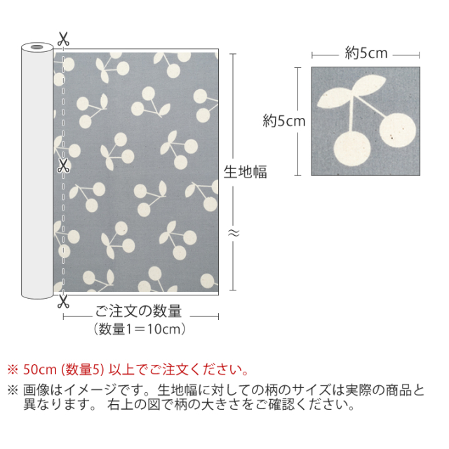 オーダーカット販売 生地幅×10cm単位(ご注文数量1=10cm) 必ず50cm(数量5)以上でご注文下さい(売切れの場合は除きます) 例)「数量5」でご注文→生地幅×50cmの生地 「数量23」でご注文→生地幅×230cmの生地 |